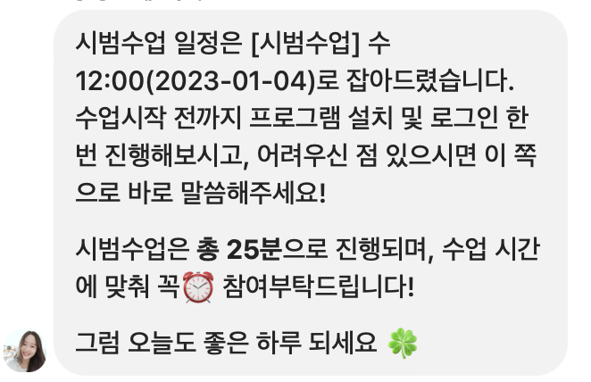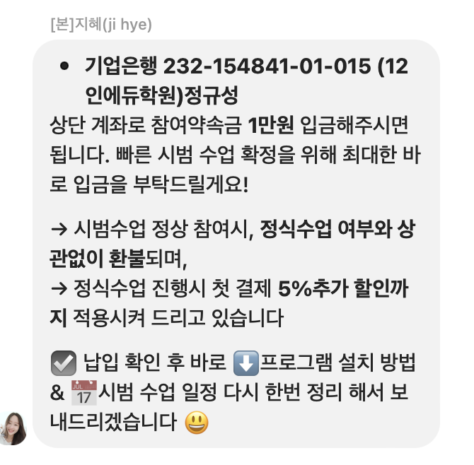 여타 화상 수업처럼 12인에듀에서도 무료 시범 수업을 1회 제공한다. 단, 1만 원이라는 보증금을 걸어야 체험 수업이 가능하고, 수업을 제대로 하면 1만 원은 돌려주신다. 물론 수업 진행 시에도 수업 비용에서 1만 원을 차감해 주신다. 1회 수업이라도 레벨 테스트 용의 짧은 수업이 아니라, 20-25분 정도로 실제 수업을 진행해 주신다. 게다가 첫 시범 수업에 대한 피드백도 정리 해서 받을 수 있다. 첫 시범 수업부터 너무 재미있게 진행을 했고, 시범 수업이 끝나면 센터에서 따로 연락이 와서 수업 결제에 대해서 상담을 해 주신다. 상담해 주시는 분도 수업을 같은 선생님께 듣고 있다는 말을 해주셔서 더욱 신뢰가 갔다. 바로 1주일에 1회 40분 수업을 3개월 수강하기로 했다.