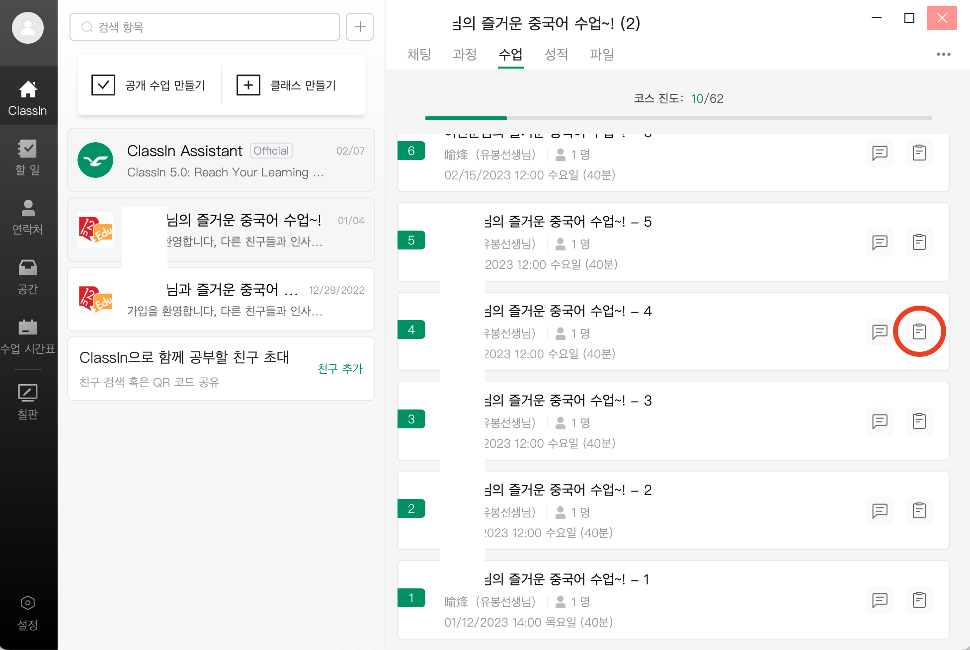 수업은 'classin'이라는 자체 프로그램을 이용해서 진행된다. 컴퓨터나 태블릿 모두 진행이 가능하지만, 컴퓨터를 이용하는 것을 추천한다고 한다. 나는 맥북을 사용하는데, 문제가 없이 잘 작동했다. 따로 동영상이나 음성이 남지는 않고, 1분에 한 번씩 화면이 캡처된다. 수업 후에 바로바로 정리하면 1분 캡처도 도움이 되지만, 개인적으로는 수업하는 동안 메모를 계속하는 편이다. 중국어를 쓰는 게 빠르지 않아서 요즘에는 그냥 한국말로 갈기고, 수업이 끝난 후 정리할 때 찾아서 정리하는 편이 빠르다는 것을 9주가 넘는 수업을 통해서 깨닫게 되었다.