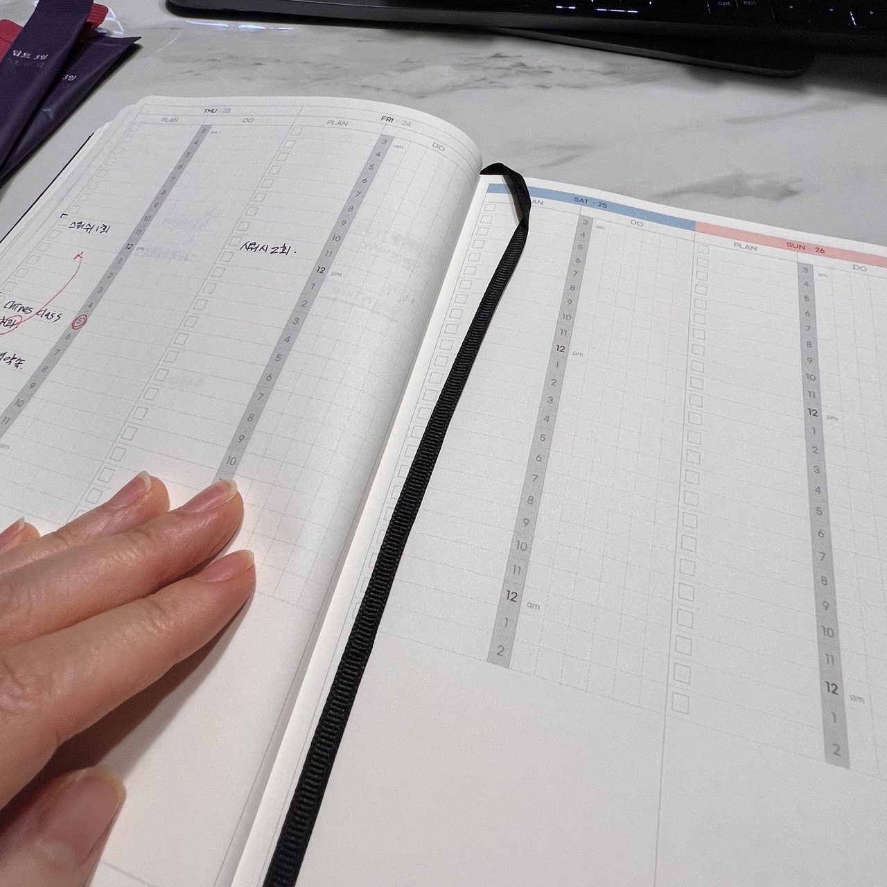 아쉽게도 디자인이나 컬러가 딱 1가지 밖에 없어요. 친구와 함께 쓰려고 두 권을 구매했는데, 둘 다 색깔이 똑같으니까, 재미가 좀 떨어집니다. 게다가 시커멓게.... 물론 일 년 동안 쓸려면 때가 안타는 블랙이 최고긴 하지만, 내년에도 또 쓸걸 생각하면 다양한 컬러가 없는 게 아쉽습니다. 단톡방이나 영상에서 다이어리를 꾸미거나, 위에 커버나 슬리브를 씌우시는 분들도 보긴 했지만, 개인적으로는 2차 가공을 싫어하고, 덕지덕지 붙이는 걸 좋아하지 않는 사람으로서는, 원래 다이어리의 가죽 커버가 조금만 다양한 색으로 나온다면 바랄 게 없을 것 같다는 생각을 했습니다. 여러가지 색으로 내주세요! 개인적으로 저는 라일락, 민트.. 좋아합니다.ㅎㅎ