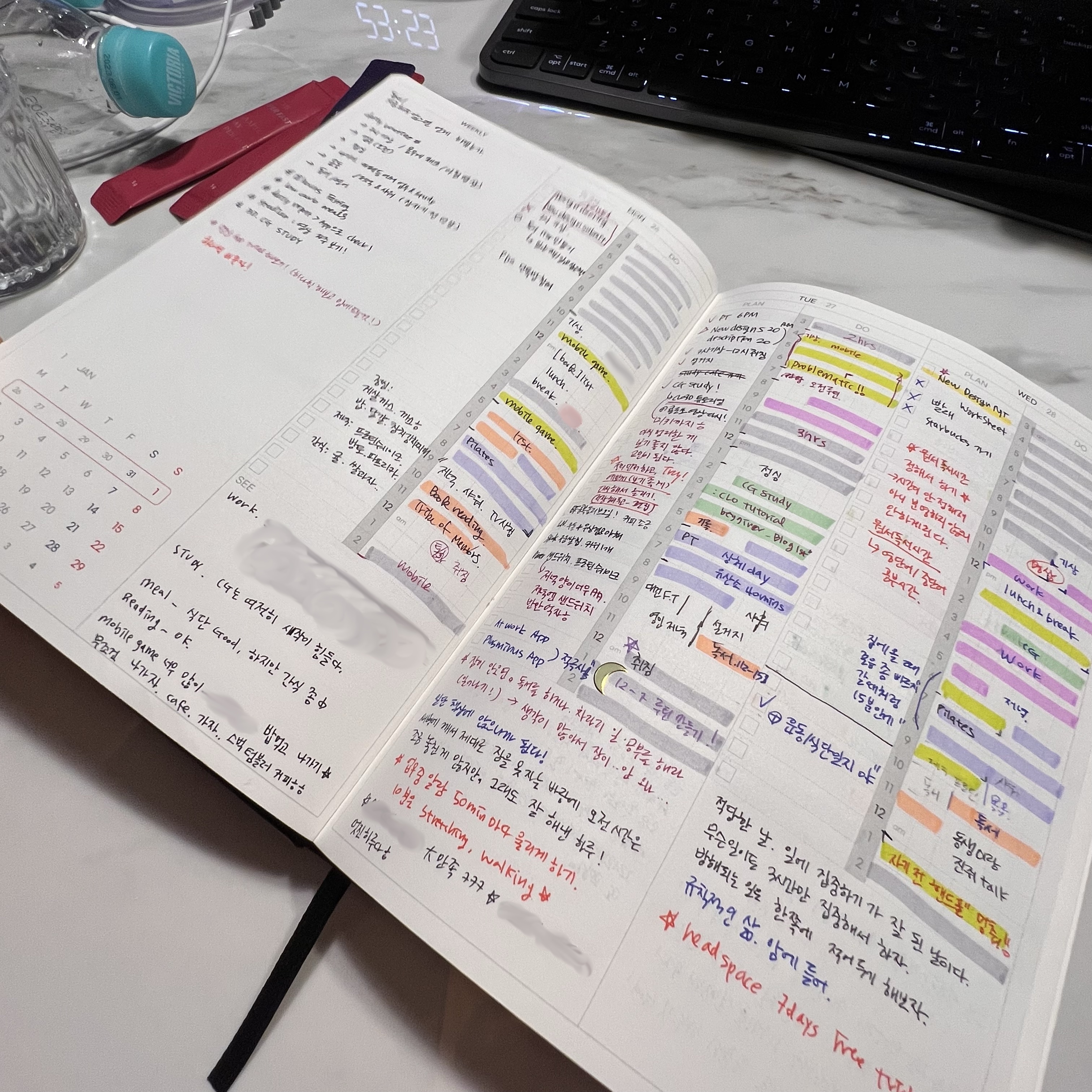 그리고 다시 디지털 다이어리로 넘어간다고 해도, 그 전에 1년 정도 종이 다이어리로 제대로 습관을 잡는 것이 좋겠다고 생각했습니다. 그래야 디지털로 넘어가더라도 꾸준히 습관을 유지할 수 있다고 생각이 되었어요. 1년 동안 이 다이어리를 사용하면서 습관을 만들고, 그다음은 제가 원하는 방식으로 기록할 수 있도록 하는 거죠. 노션을 이용하던, 구글닥을 이용하던, 혹은 다양한 앱을 사용하던, 굿노트에 템플릿을 이용하는 방법까지 다양한 방법으로 기록이 가능하다.