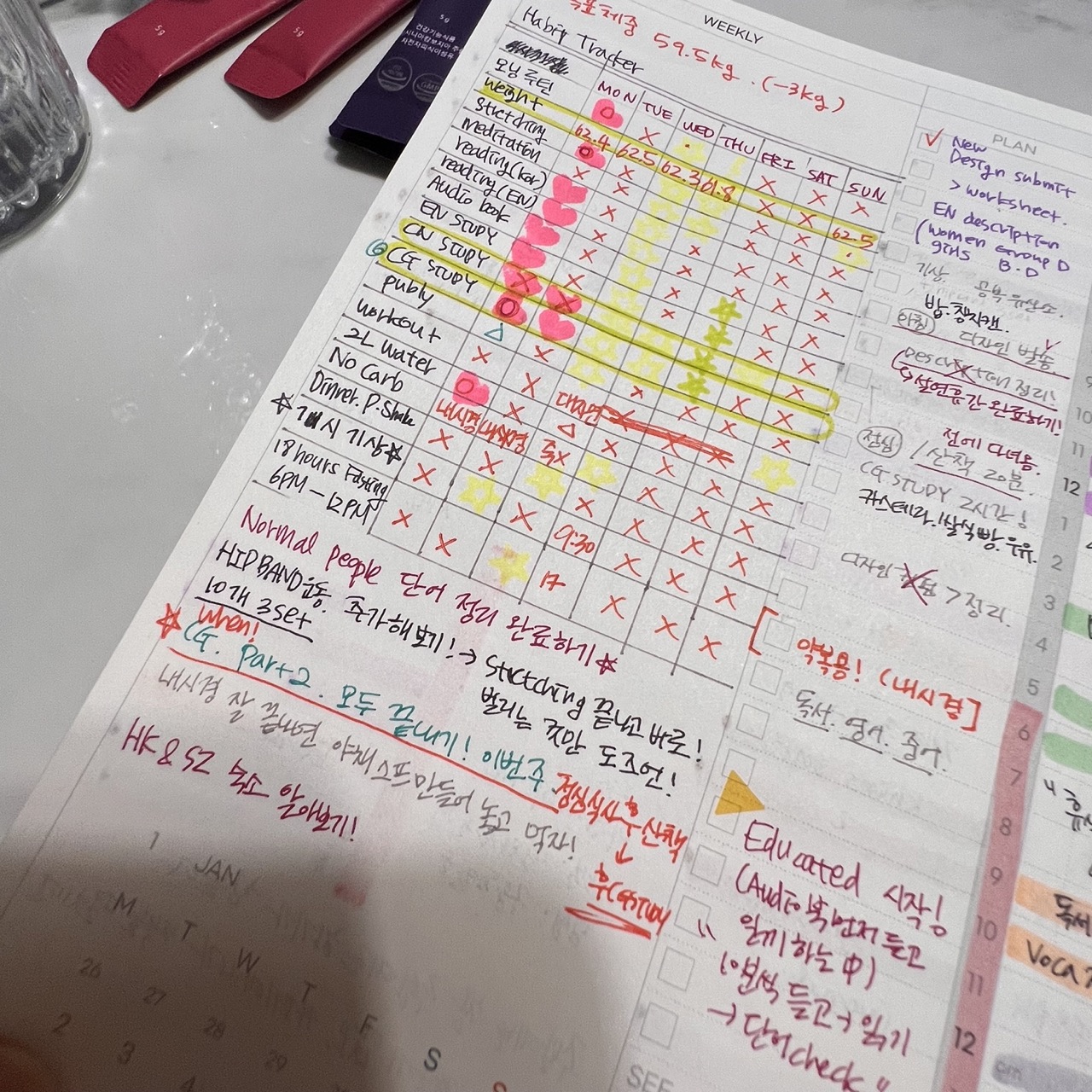 위클리 페이지 활용 habit tracker를 만들어서 사용합니다. 월력에 사실 있긴 하지만, 저는 주별로 트랙하는 게 더 짧게 짧게 목표를 세울 수 있어서 도움이 되는 것 같더라구요. 그리는 게 조금 귀찮을 때도 있긴 한데, 하다보면, 지난주를 정리하는 느낌도 들고, 새로운 주를 새롭게 시작한다는 느낌이 들어서 좋습니다. 예전에는 세세한 부분도 리스트로 만들어서 트래킹 했는데, 지금은 좀 더 간단하게 만들어서 사용하고 있습니다.