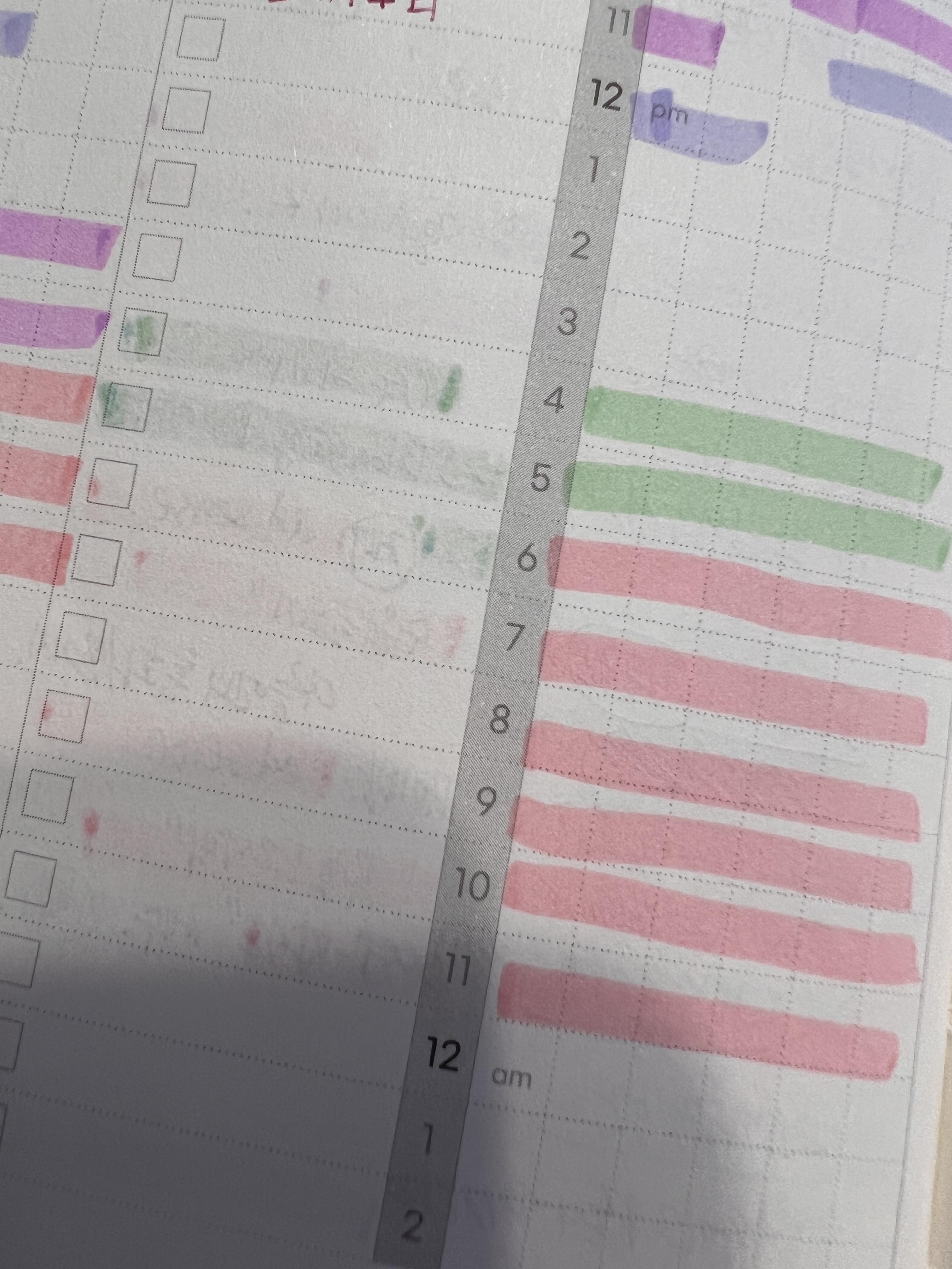 심플하다고 했지, 기능이 없다고는 안 했습니다. 월력에는 그 달의 중요한 메모를 할 공간도 있고, 월별로 습관 만들기를 하시는 분들을 위한 habit tracker도 있어서 아주 요긴하게 쓰일 수 있습니다. 당연히 두 번 말할 필요도 없는 데일리파트는, 앞서 말한 PDS로 칸이 나뉩니다. 시간을 따로 기입할 필요 없이 24시간이 표시가 되어있어서 편하게 기록이 가능합니다.