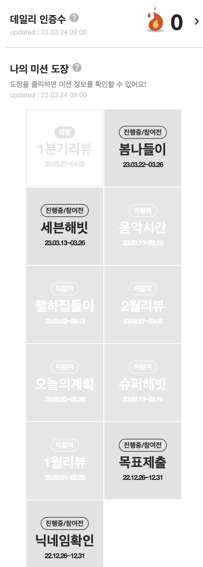 베타시스템이 도입되면서 단톡방에서 인증한 내용을 한번에 체크할 수 있는 페이지가 생겼는데요, 데일리 인증 수에 불이 활활 타오르는 걸 보니, 인증을 열심히 해 봐야 하나 싶습니다. 사실 이번 달은 정말 다이어리를 제대로 쓰지 못했거든요.